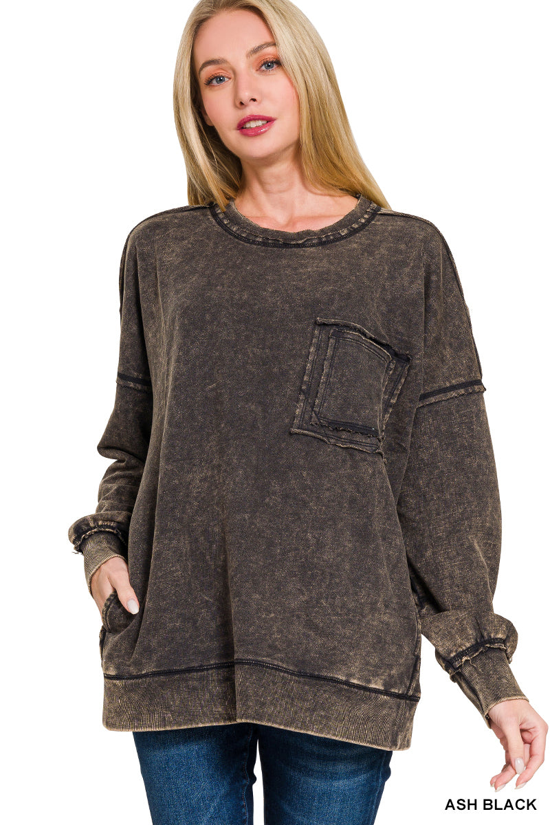 FRENCH TERRY ACID WASH RAW EDGE FRONT POCKET PULLOVER WITH POCKETS