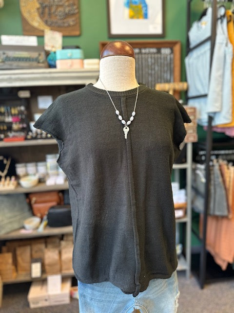 Black Raw Seam Cap Sleeve Round Neck Knit Top