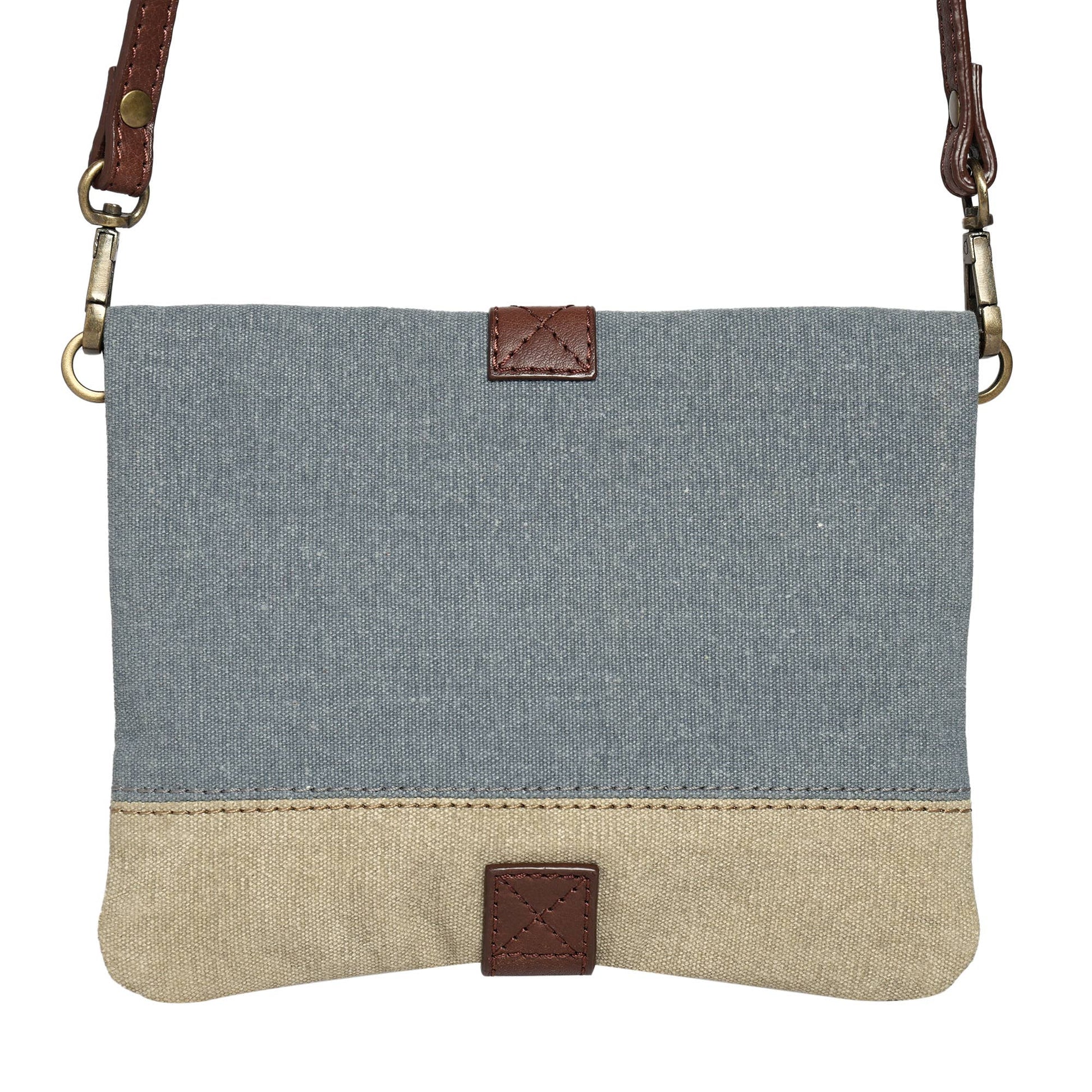 Size: 9" W x 8" H x 2" D Handle: 23" Strap Exterior Features: One Slip Pocket Closure: D Hook Closure Material: Up-Cycled Canvas dusty, beige leather dark brown.