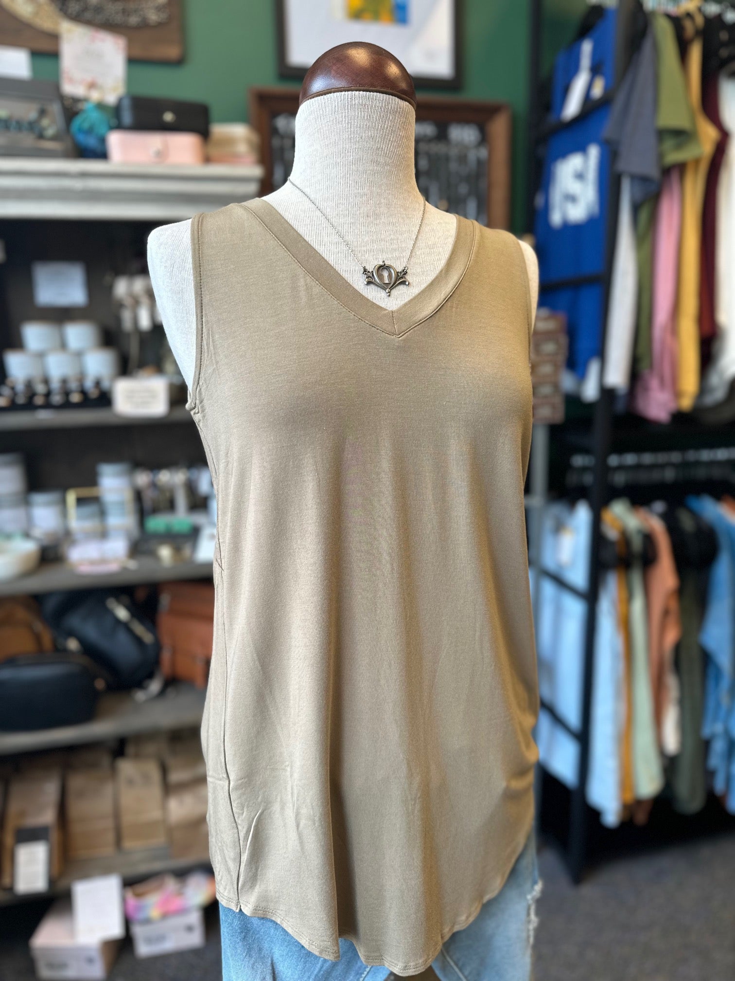 $10 Rack - Khaki Luxe Rayon Sleeveless V-Neck Hi-Low Hem Top